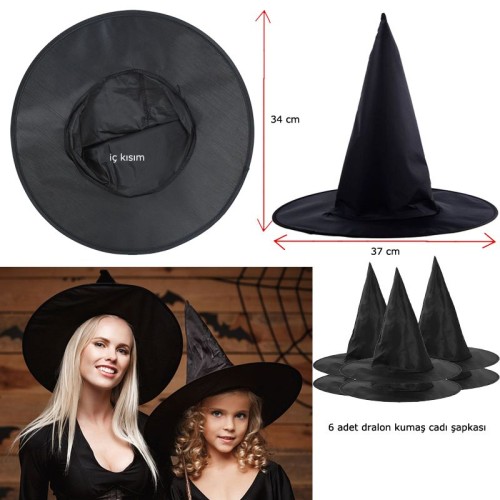 Halloween Siyah Renk Dralon Kumaş Cadı Şapkası Yetişkin Çocuk Uyumlu 6 Adet